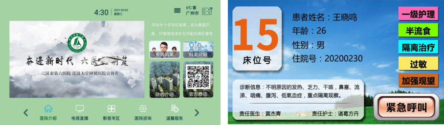 患者使用数字化病房的病床触控终端设备,设备集合医护呼叫,视频对讲,影视点播,健康宣教,信息查询,营养点餐,医护信息