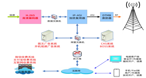 按照5个地面数字频点规划,高清节目每个频点规划12套,可发射高清H.265节目60套;标清节目每个频点规划18套可发射标清节目90套。本系统是利用现有的DTMB激励器、无线发射机,增加信源设备、高清H.265编码设备、复用加扰设备和管控系统等设备,就能解决目前DTMB地面数字高清节目少、用户量少的问题,发挥巨大社会效益和经济效益。
