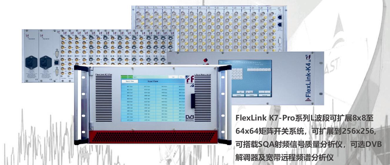 L波段可扩展8x8至64x64矩阵开关系统,可扩展到256x256,可搭载SQA射频信号质量分析仪,可选DVB解调器及宽带远程频谱分析仪