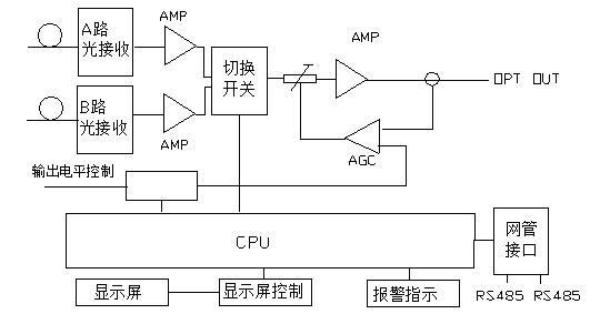 (2)通道控制电路:采用了GAINCOM公司通道快速切换技术,通道切换时间为5ms左右,大大低于同行20ms的水平,在直观效果上没有闪烁感。正常使用时,工作在A路,当A路入口光功率低于-6dB时,自动切换到B路,如果B路入口光功率也低于-6dB,A路不切换。